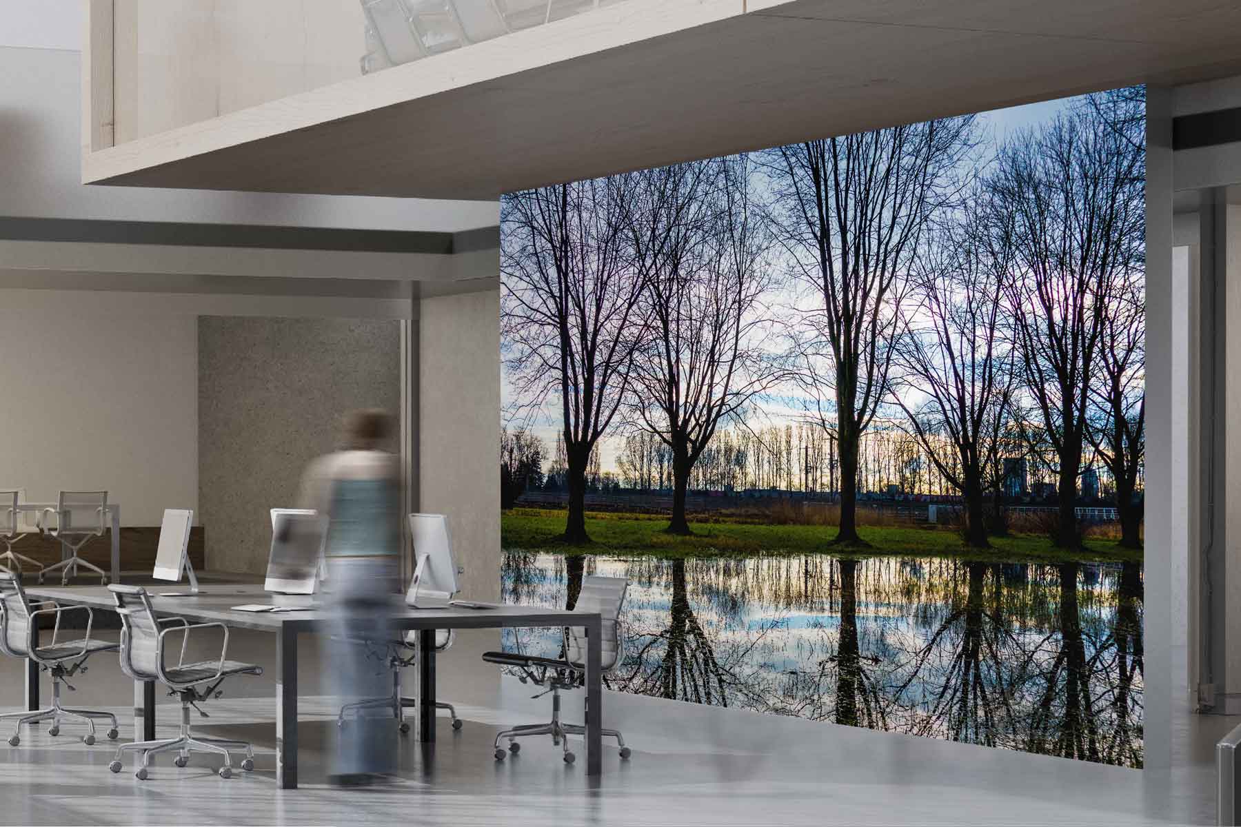 In deze foto zie je de reflectie van de bomen in een plas. Het gebied is drassig, maar op de achtergrond zie je al een voorbeeld van de moderne Nederlandse infrastructuur. Hier ligt namelijk een spoor voor de Hogesnelheidslijn. Deze lijn verbindt Amsterdam met Antwerpen, een totale afstand van 147 kilometer waar treinen wel meer dan 200 kilometer per uur kunnen rijden.